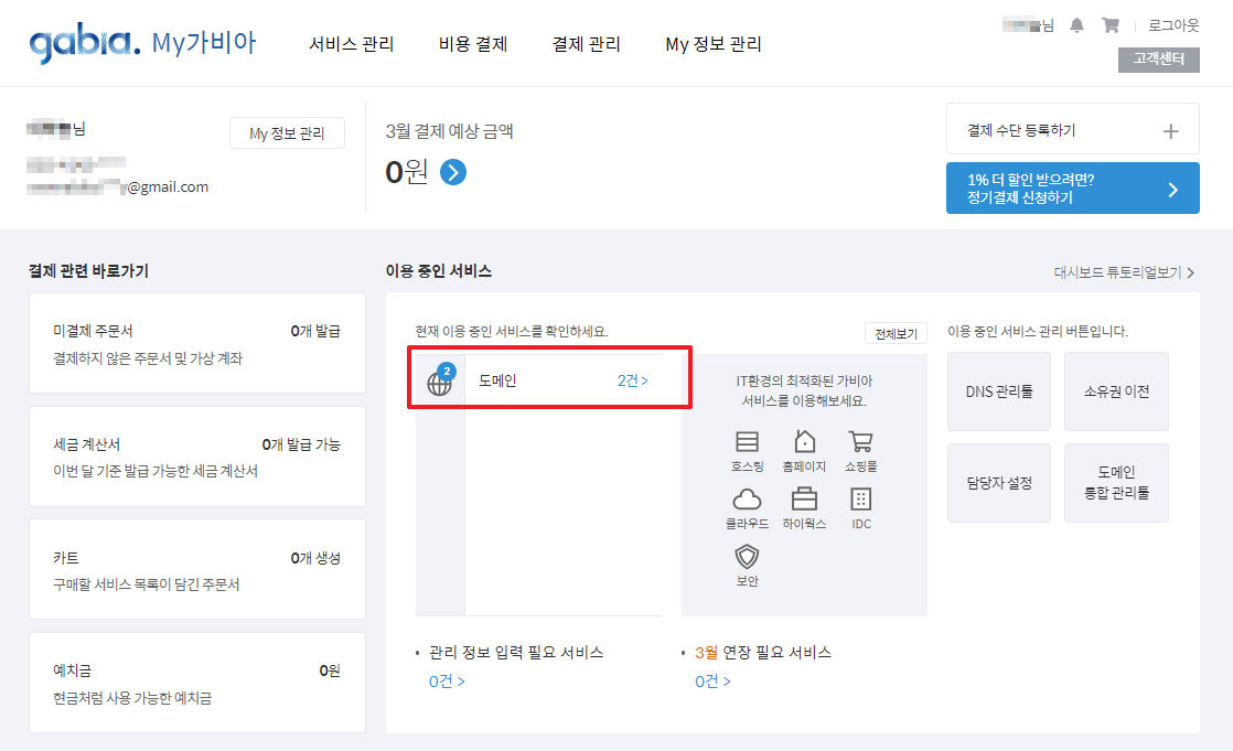 도메인 구매를 위해 많이 사용하는 사이트인 가비아 입니다. (필자가 사용 중)
