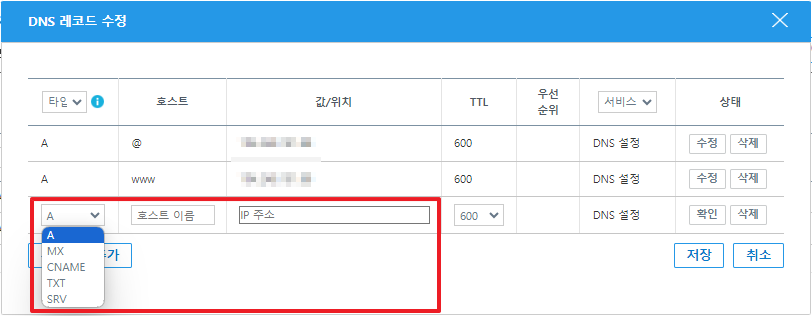 - 워드프레스 설정 시: 타입 'A', 호스트 이름(하위 도메인 주소) 입력, 'IP 주소'에 워드프레스 서버 IP 주소 입력
