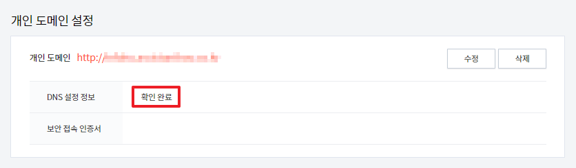왼쪽 설정의 메뉴에서 '관리' - '블로그' - '개인 도메인 설정'의 '도메인 연결하기'를 클릭합니다.