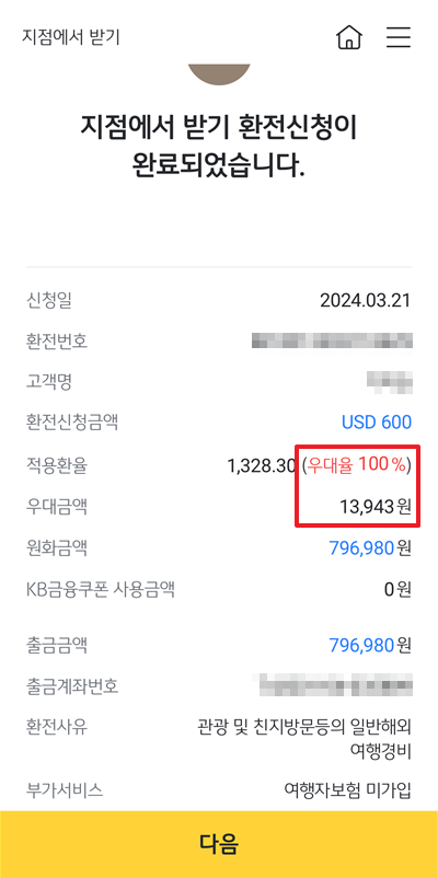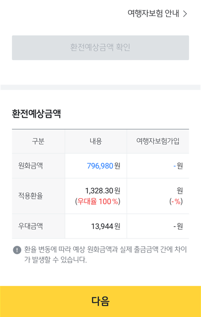 환전 신청 금액을 최종적으로 확인하고 다음을 눌러주면 환전이 마무리됩니다.