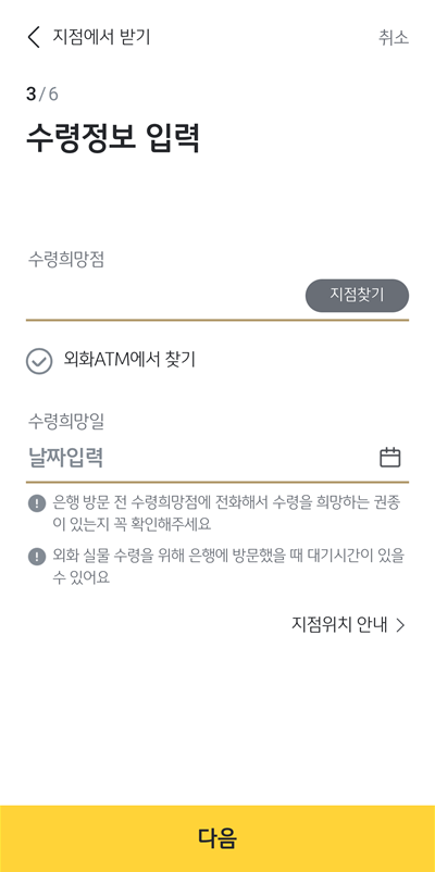 다음으로 수령을 희망하는 지점과 날짜를 입력해 줍니다.