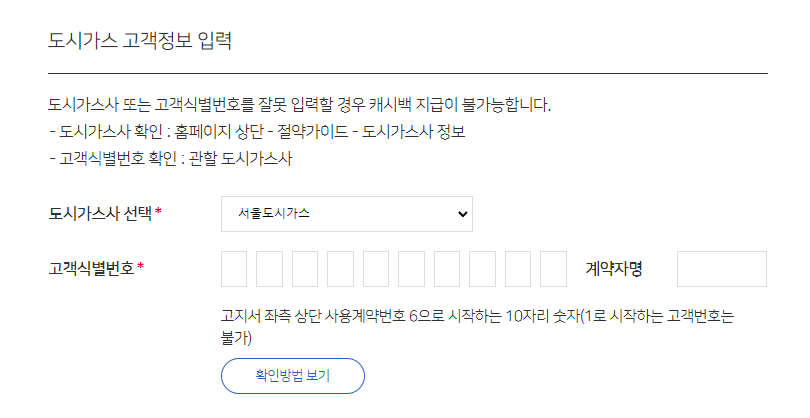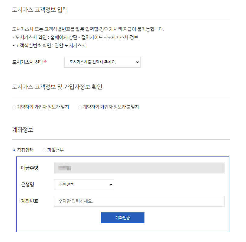 도시가스 고객정보와 캐시백 받을 계좌 정보에 대한 입력을 합니다.