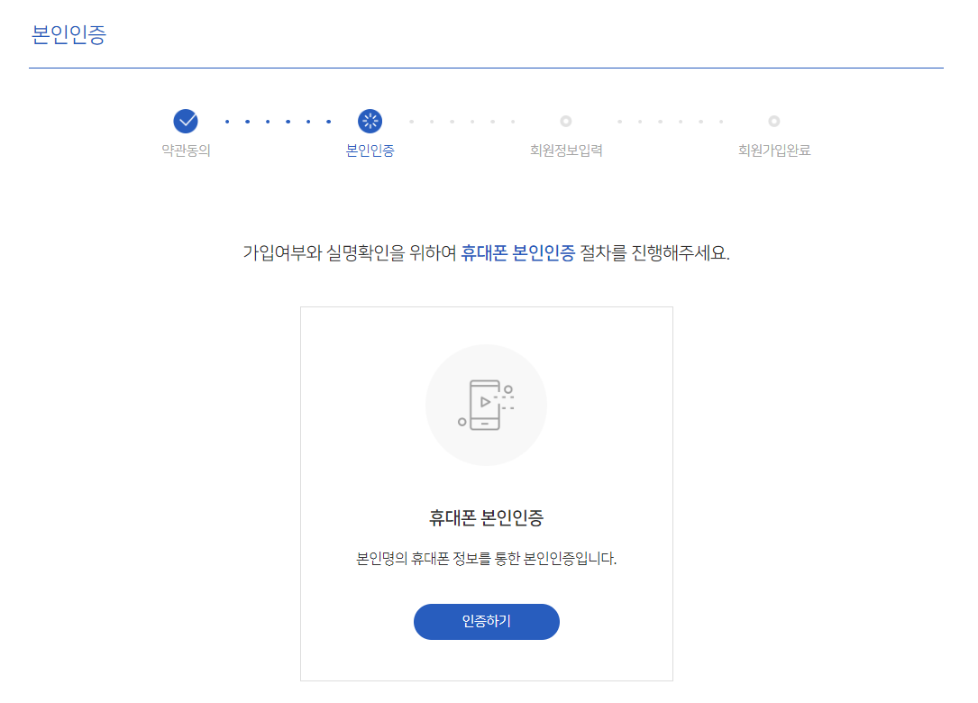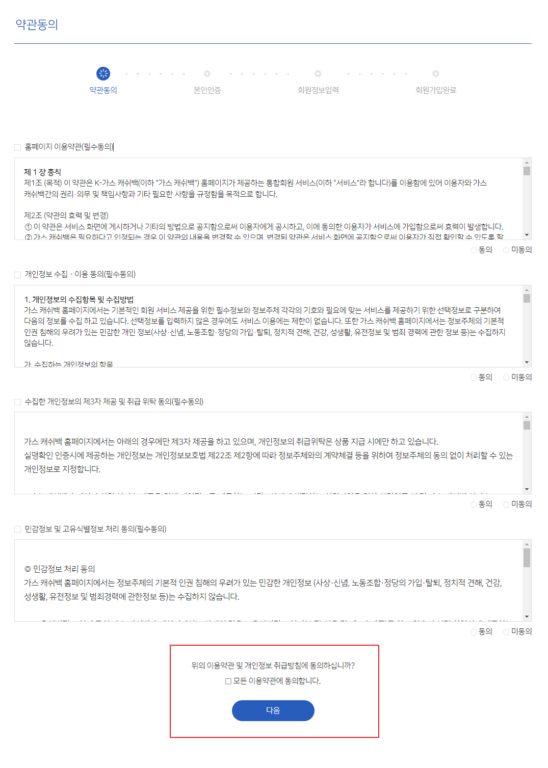 아래 '모든 이용약관에 동의합니다'를 클릭하고 다음으로 넘어갑니다.