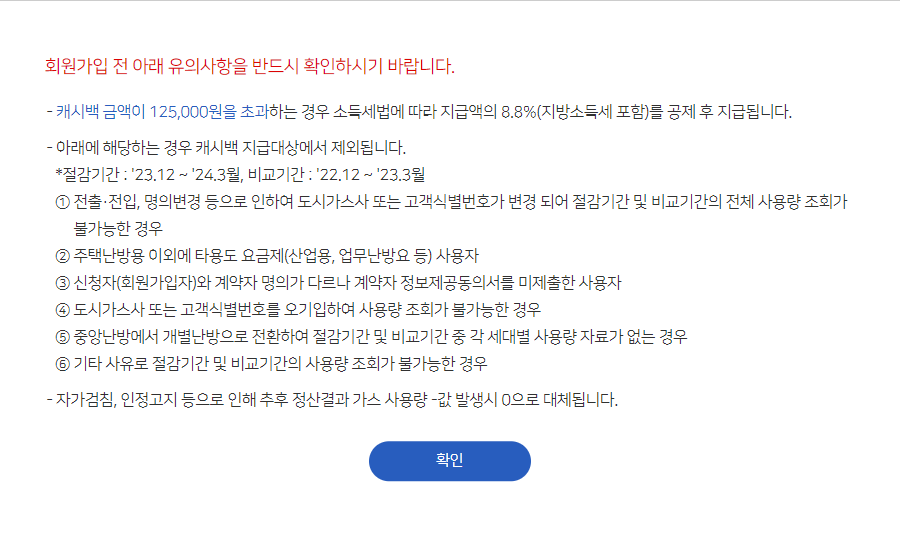 이로써 도시가스 캐시백 사이트 회원가입과 도시가스 절약 캐시백 신청이 완료되었습니다.