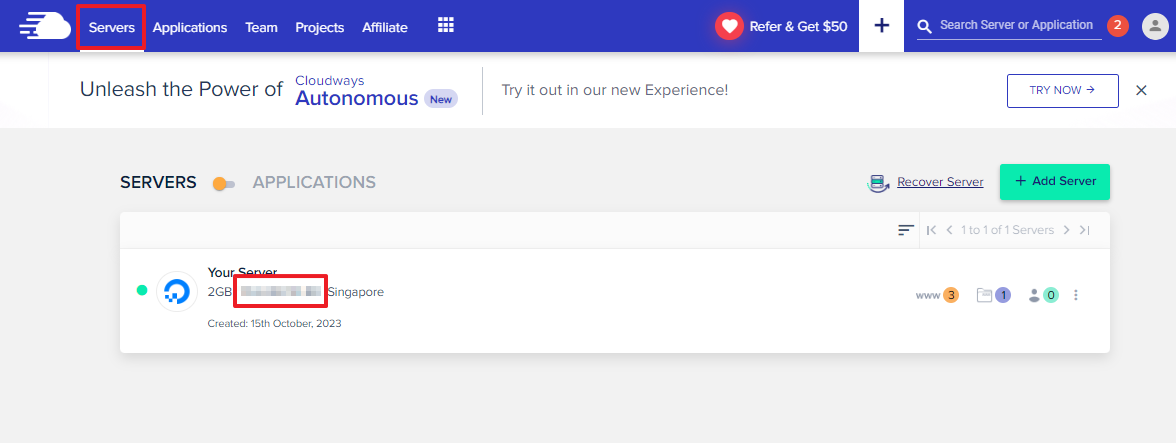 그 사이 클라우드웨이즈의 메인, 서버를 클릭하여 IP 주소를 확인해 줍니다.