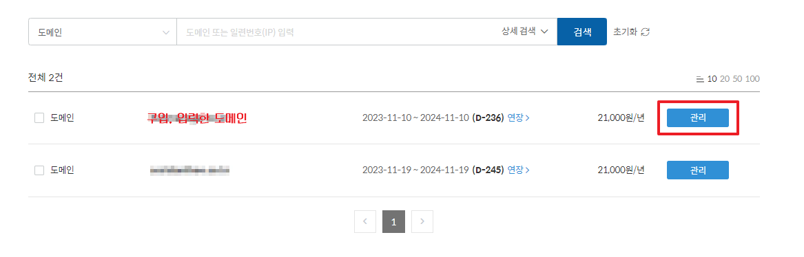 도메인을 구입한 가비아에서 '관리'를 눌러줍니다.
