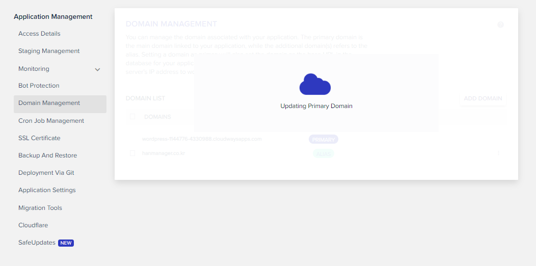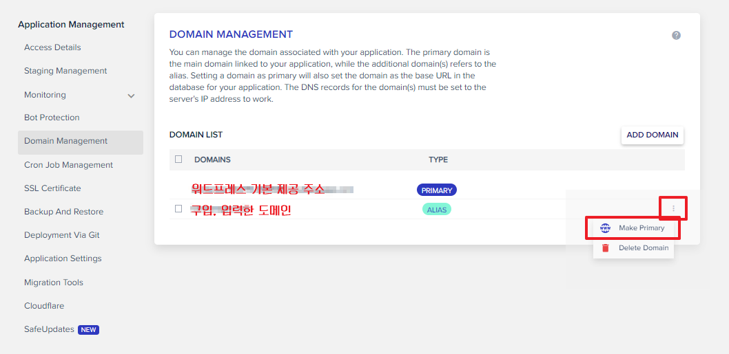 도메인이 연결, 등록되고 입력한 도메인을 메인(PRIMARY)으로 만들어 주어야 합니다.