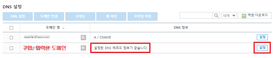 구입한 도메인의 '설정된 DNS 레코드 정보가 없습니다'를 확인하고 '설정'을 눌러줍니다.