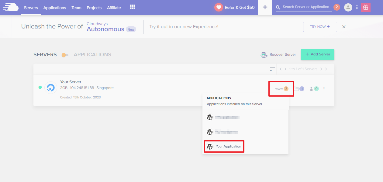 다시 클라우드웨이즈로 돌아가서, 'Your Application'으로 들어갑니다.