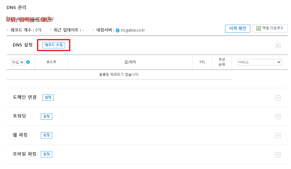 관리 페이지 아래쪽에 'DNS 정보' - '도메인 연결' - '설정'을 눌러줍니다.
