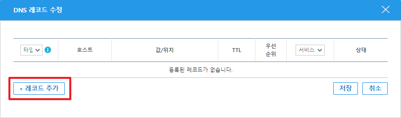 '레코드 추가'를 2번 클릭하여 호스트에 각각 @, www 를 입력하여 각각 확인 클릭 후 저장을 눌러줍니다.