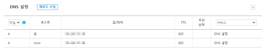'레코드 수정'을 눌러 IP 주소를 연결해 줍니다.