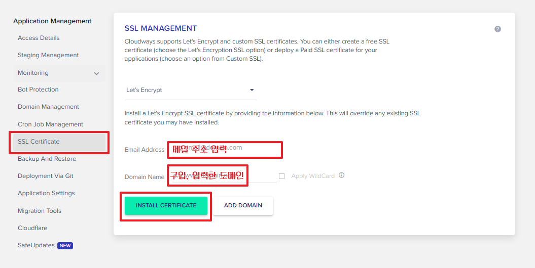 'SSL Certificate'에서 SSL 보안서를 발급받기 위해 '메일 주소'와 '도메인 주소'를 입력해 줍니다.