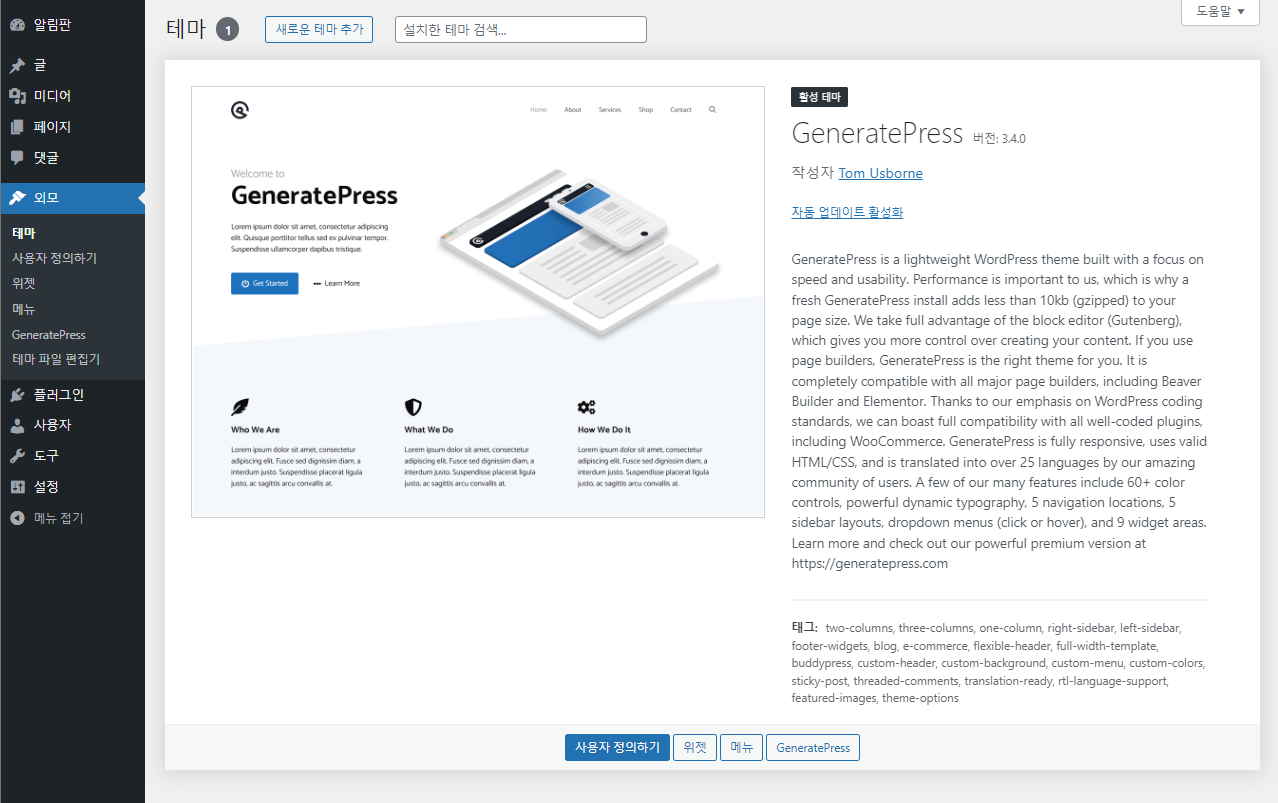 이렇게 하나만 남으면 일반적으로 많이 사용되는 'GeneratePress' 테마의 설치가 완료됩니다.