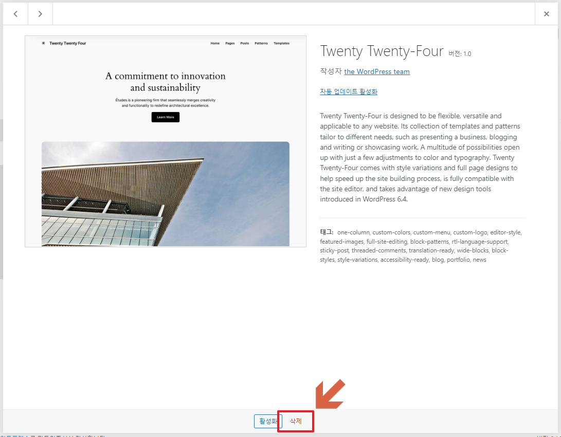 설치가 완료되면 '활성화'를 눌러 테마를 적용시켜 줍니다.