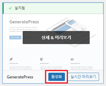 GeneratePress 테마 설치 후, 다른 테마들은 각 테마들의 '테마 상세정보'를 클릭,