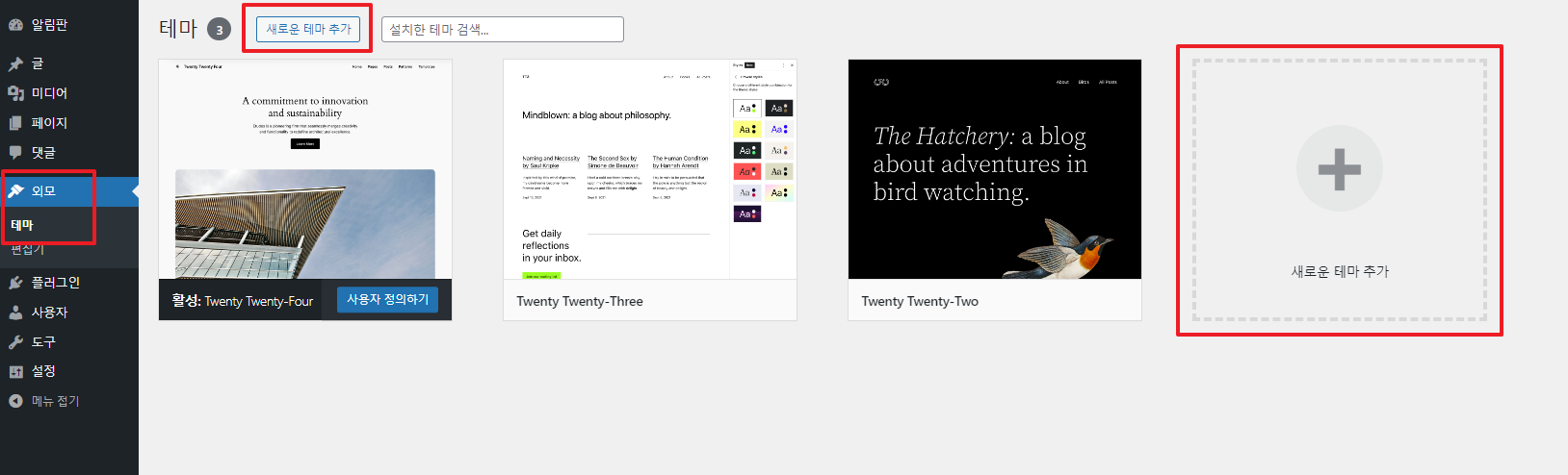 '외모' - '테마' 에서 '새로운 테마 추가'를 눌러줍니다.
