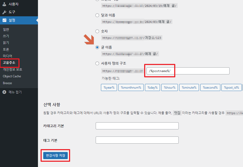 다음으로 글 주소 변경을 위해 '설정' - '고유주소' - '글 이름' 체크 및 '%postname%' 확인' - '변경사항 저장' 클릭합니다.