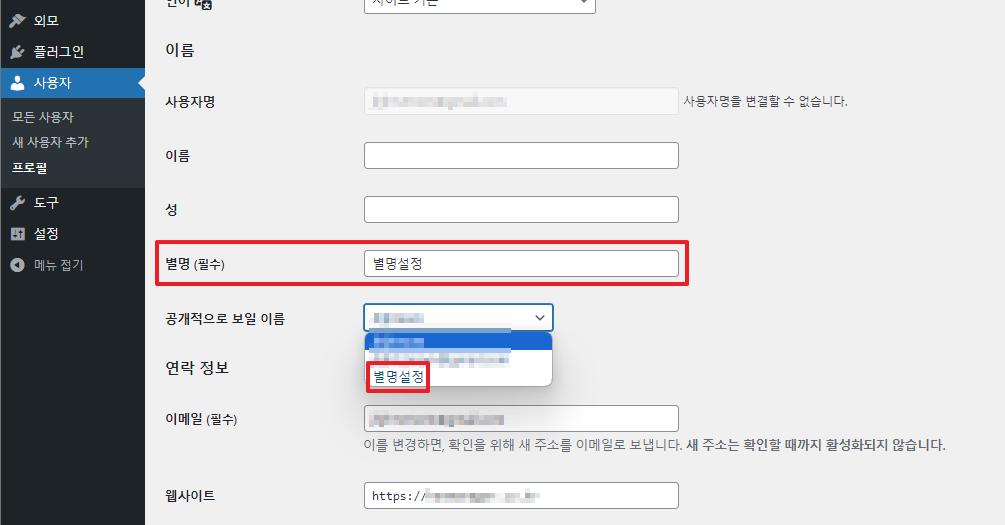 이는 추후 워드프레스 블로그에서 표시될 '나의 이름'으로 아무래도 익명성을 가진 별명을 설정해 주는 것이 좋을 것 같습니다.