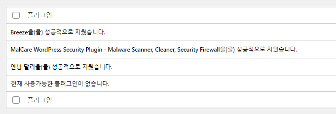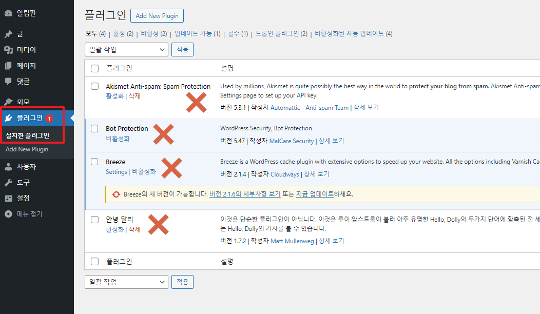 바로 삭제 버튼이 보이지 않는 경우, '비활성화' 클릭 후 '삭제'를 눌러 플러그인을 제거해 줍니다.