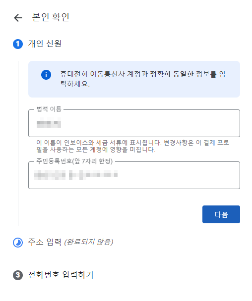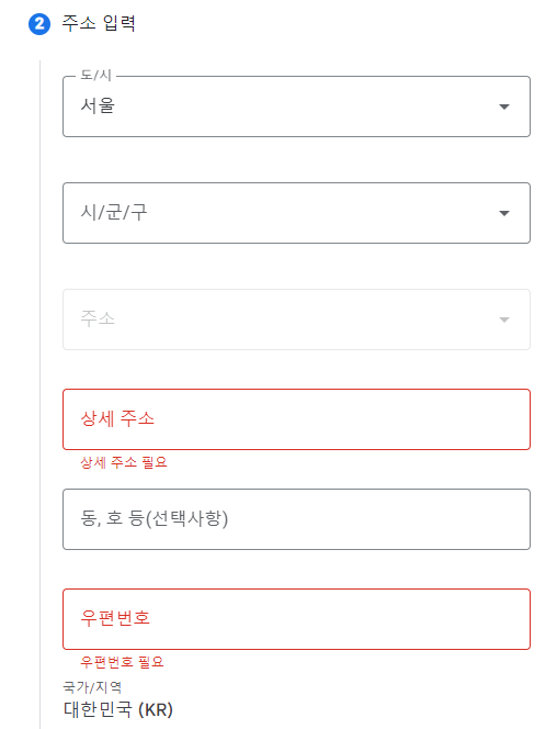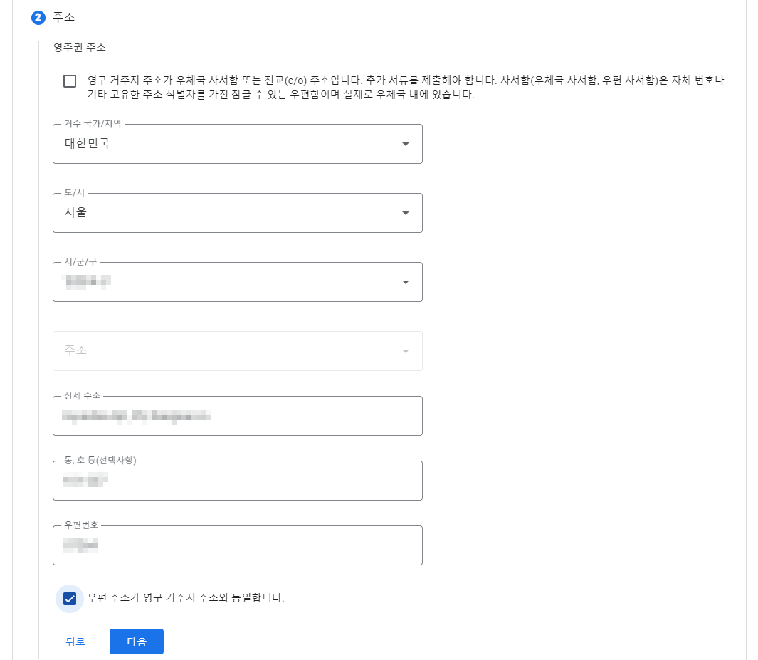 주소 역시 영어로 입력해 주고 '다음'을 눌러줍니다.