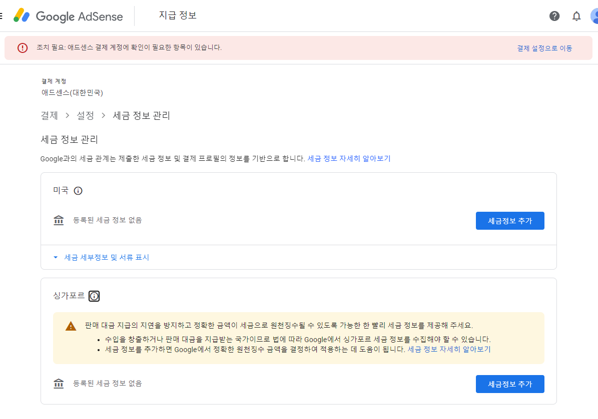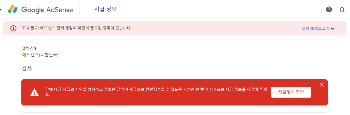 오늘은 '조치 필요: 애드센스 결제 계정에 확인이 필요한 항목이 있습니다.'에 대해 해결 방법을 기록해 보겠습니다.