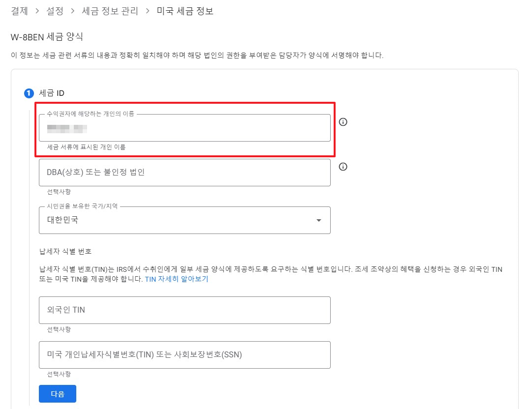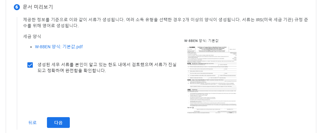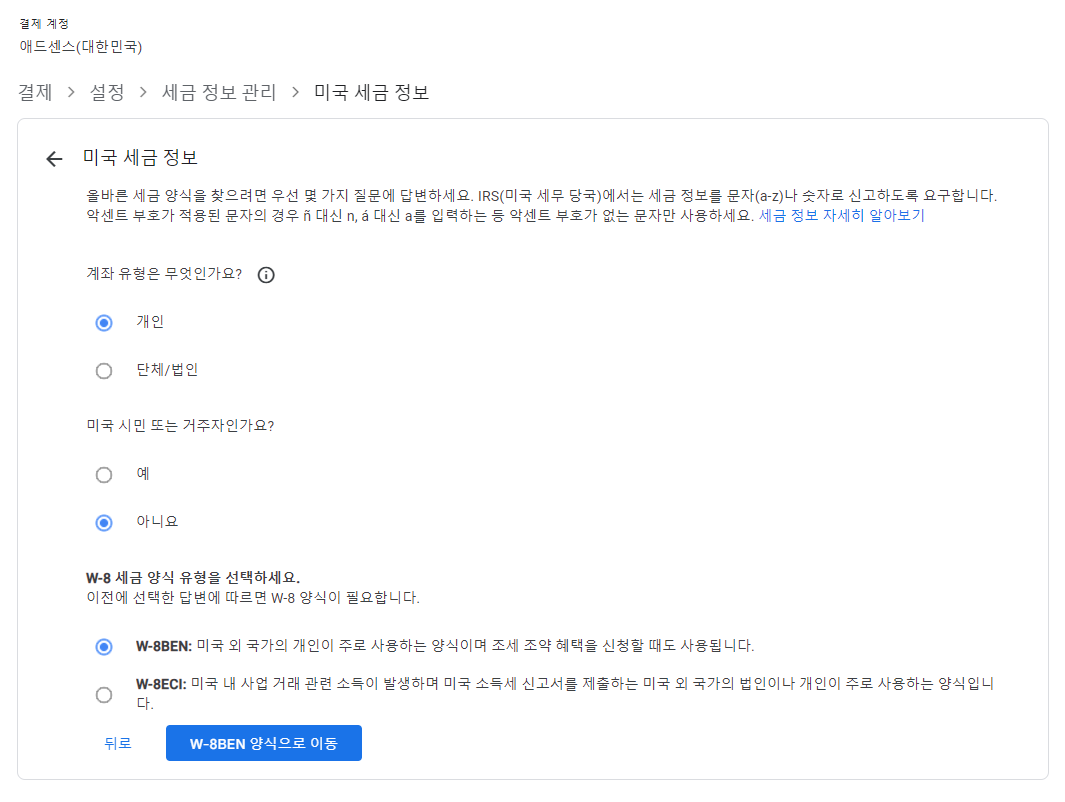 위와 같이 항목들을 눌러주고 'W-8BEN 양식으로 이동'을 눌러줍니다.
