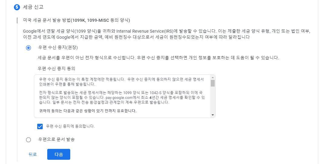 세금 신고에서 '우편 수신 중지(권장)'을 클릭, '다음'을 눌러줍니다.