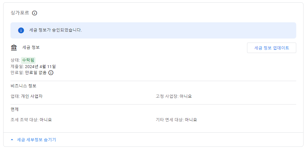 간단하게 '싱가포르 세금정보' 입력이 마무리되었습니다.