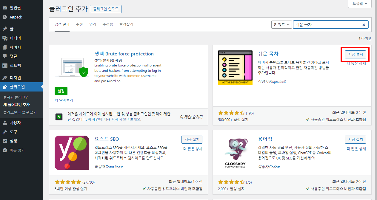새 플러그인 추가 에서 '쉬운 목차'를 키워드 검색하여 설치 및 활성화 시켜줍니다.