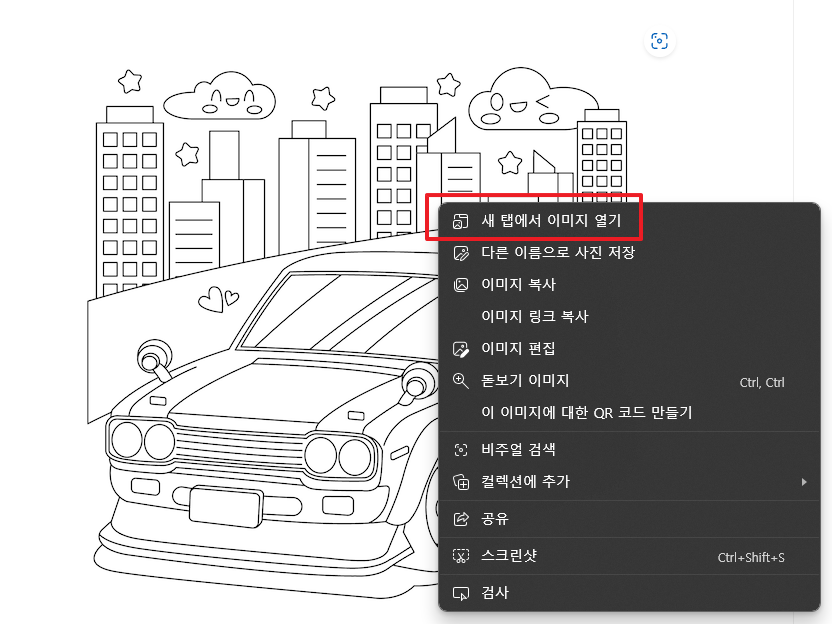 2. 새 탭에서 이미지가 열렸다면, 'Ctrl + P' 또는 사진 바깥 쪽을 마우스 우측 클릭하여 '인쇄' 버튼을 눌러 인쇄합니다.