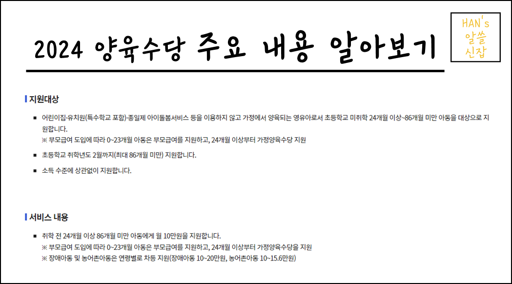 양육수당 역시 소득 수준에 관계없이 24~86개월 아동이라면 매월 10만 원씩 지급됩니다.
